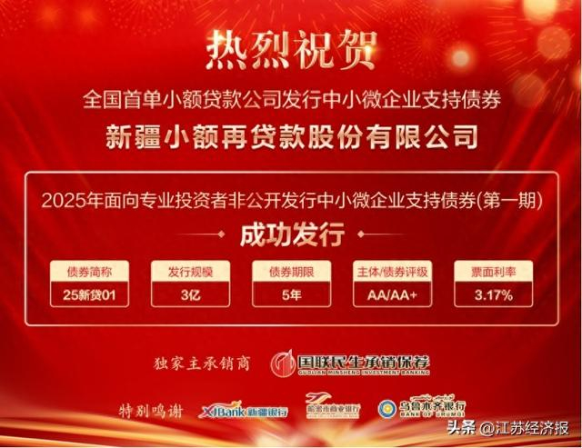 6月3日,新疆小额再贷款股份有限公司(以下简称“发行人”)2025年面向专业投资者非公开发行中小微企业支持债券(第一期)成功发行。