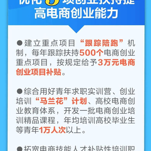 优化3项创业扶持提高电商创业能力。建立重点项目“跟踪陪跑”机制,每年跟踪扶持500个电商创业重点项目,按规定给予3万元电商创业补贴。综合用好青年求职实训营、创业培训“马兰花”计划、高校电商创业教育体系,年均培训大学生1万人次以上。拓宽电商技能人才补贴性培训职业(工种)目录,推广“学历证书+若干职业技能证书”制度,提升电商创业技能。