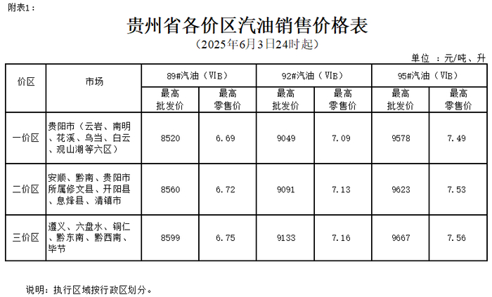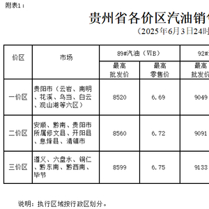 根据成品油价格形成机制,国家发展改革委决定自2025年6月3日24时起上调国内成品油价格。按照国家调整要求和相关规定,贵州89#汽油(国VIB)、0#柴油价格每吨在现行标准基础上分别提高65元、60元,具体价格可由各经营企业在不超过最高批发、零售价格的前提下确定。调整后各油品最高价格见附件。
