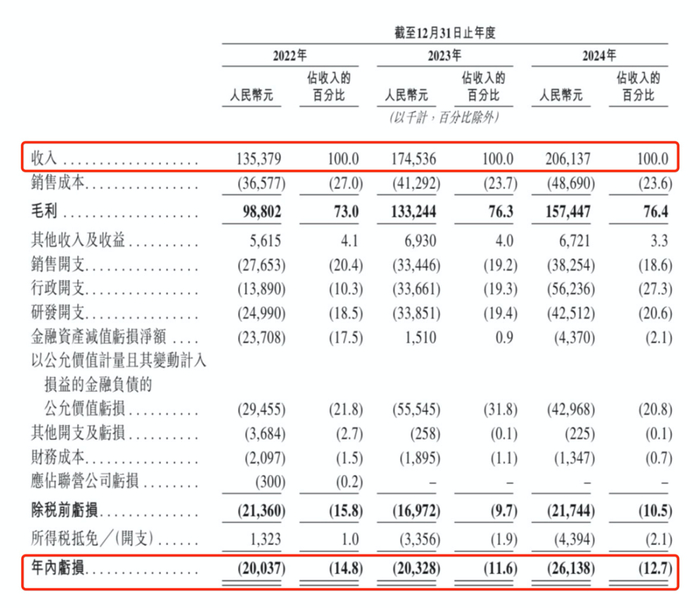 财务数据显示,在过去的2022年、2023年和2024年,元光科技的营业收入分别为人民币1.35亿、1.75亿和2.06亿元,相应的净亏损分别为人民币2003.7万、2032.8万和2613.8万元,相应的经调整净利润分别为人民币981.4万、4649.5万和5421.9万元。
