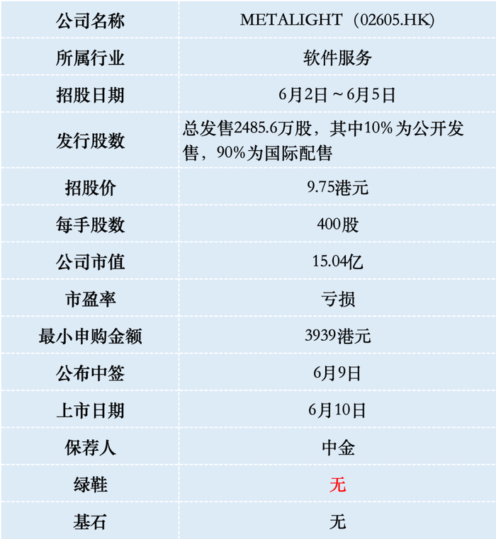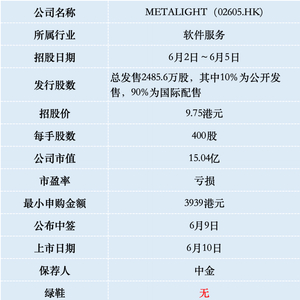 METALIGHT此次IPO发行股份占全部股份比例的16.11%,招股价9.75港元,募资约2.4亿港元,没有基石投资者都是流通盘,对于市值只有15亿的公司来说,这个流通盘不小了。