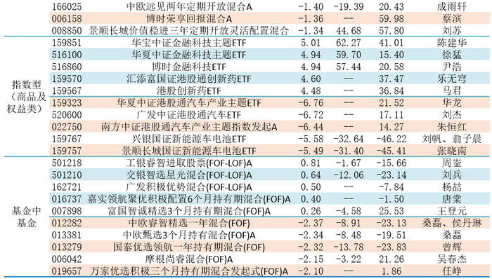 个基表现方面,医药生物等板块周内领涨,相关的主题行业基金或相关板块个股持仓比例较高的产品涨幅居前;而汽车等板块走势较为低迷,相关主题行业基金或重配相关板块个股的产品表现不佳。