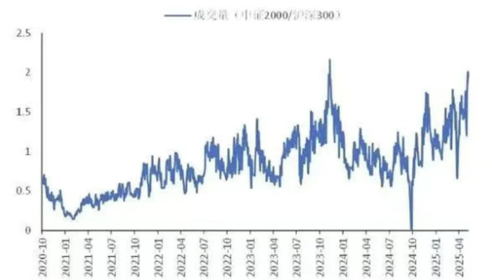 反映市场对小盘股追捧情绪的成交额比值(中证2000成交额/沪深300成交额)也达到了历史上仅次于2023年11月底12月初的高点