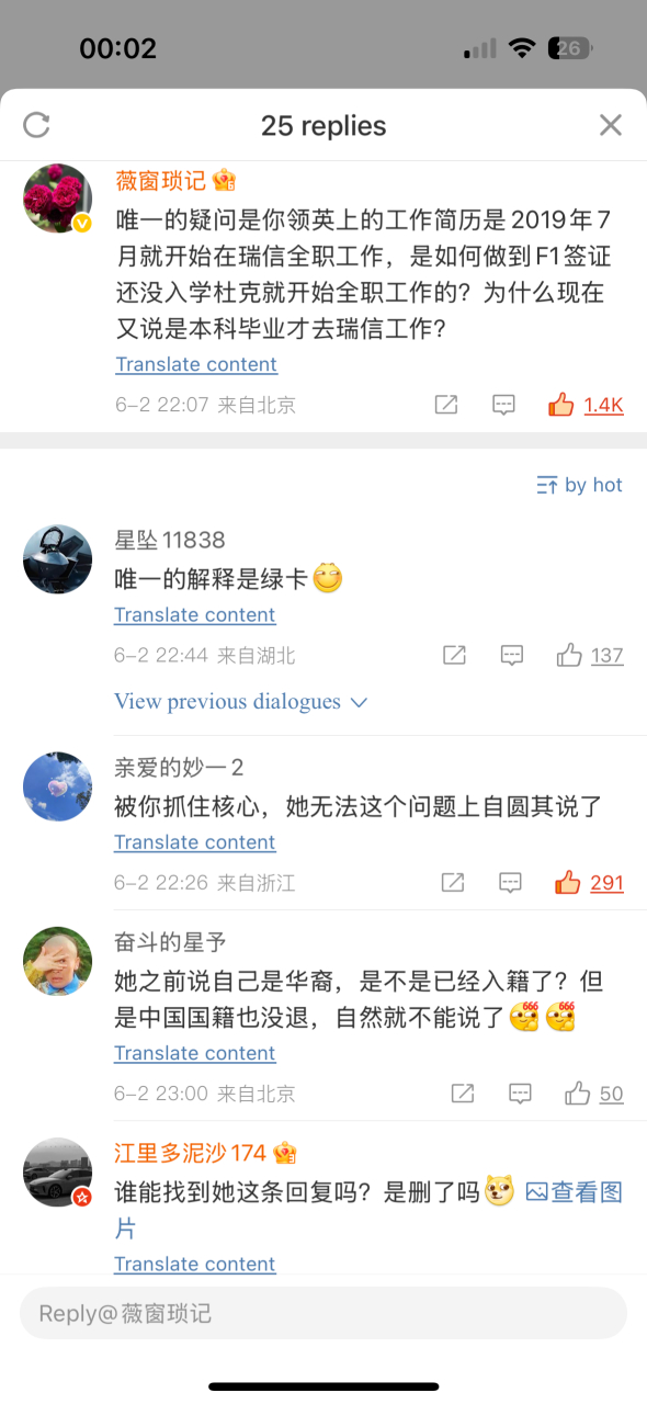 然后就是读书与全职工作的时间线重合。初中毕业以全额奖学金到英国读高中,在英国华威大学读书,大三转学到杜克大学,其间与她在瑞士信贷的全职工作经历有时间重合,人们质疑她如何一边读书又一边完成全职工作,而且还是在没有绿卡的情况下。