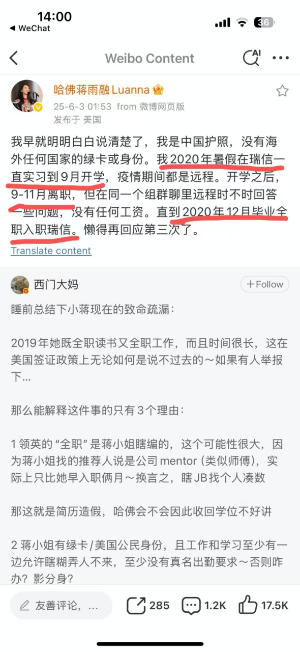 随着蒋雨融求学经历的不断被扒,以及蒋雨融在社交媒体的不断发声自证,国内舆论场上的争议之声越来越响,蒋雨融哈佛演讲事件出现令人震惊的戏剧性反转……