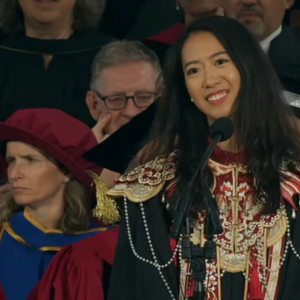 2025年5月29日,蒋雨融作为哈佛校史上首位中国女毕业生代表,在哈佛大学毕业典礼上发表主题为“我们的人性”的演讲。她身穿学位服搭配中国传统服饰云肩,演讲现场气氛热烈,听众多次鼓掌。