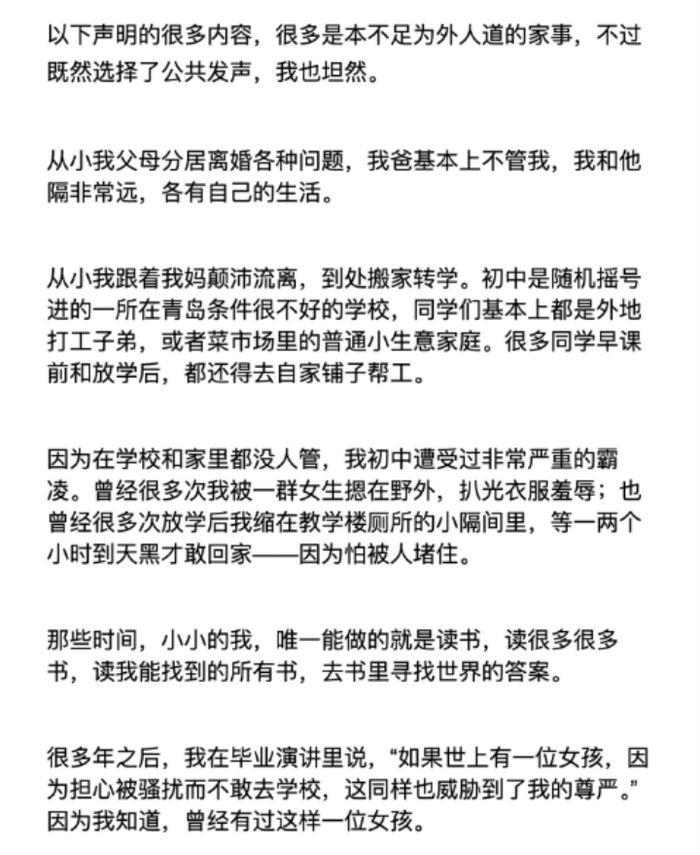 她继续通过个人社交媒体账号,澄清自己未曾依赖父亲的关系而入学哈佛,详细说明母亲与父亲早年离异,自己是在颠沛流离之中获得了在哈佛的一切成就,而周晋峰的推荐信并没有在她的入学中起到什么有效的作用。