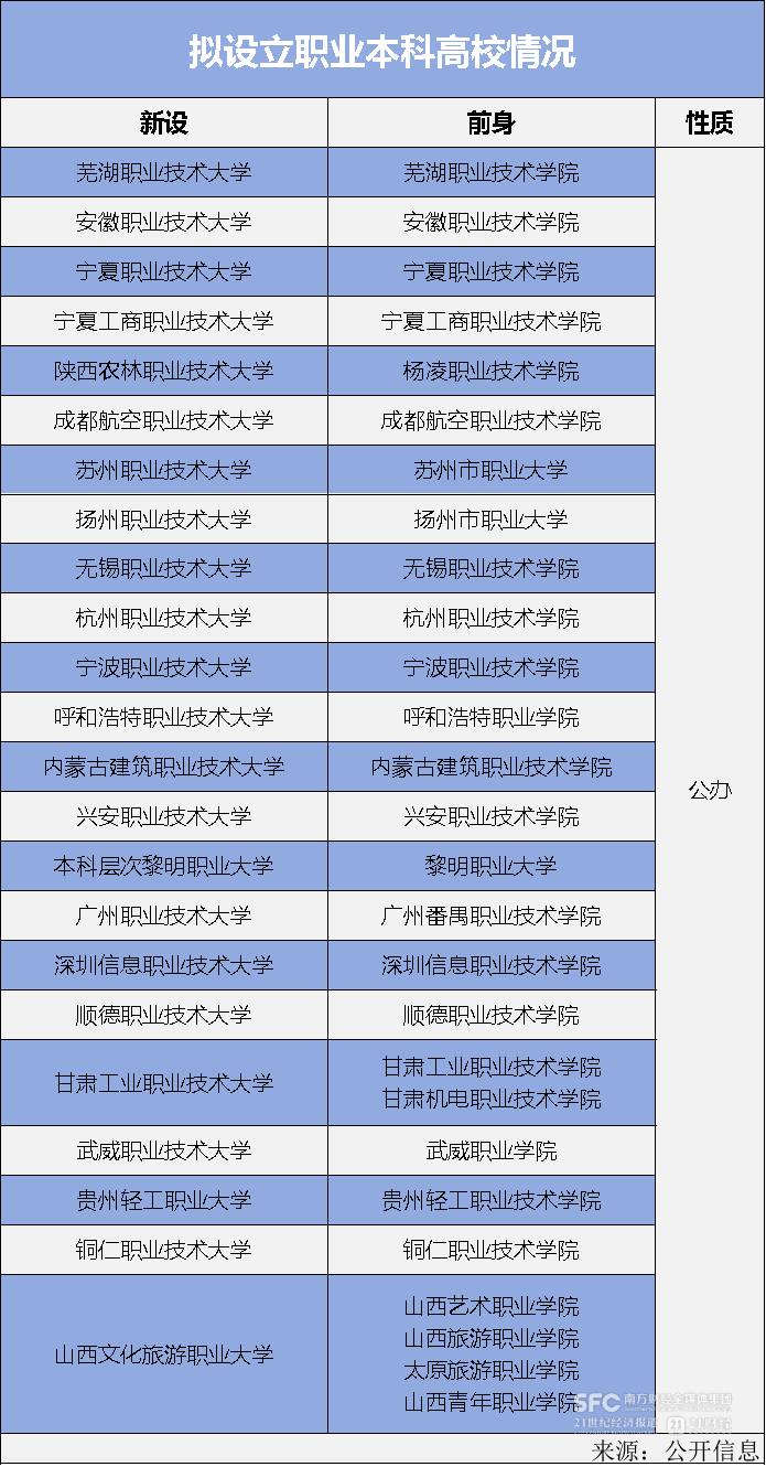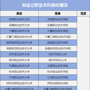 5月22日,教育部对拟同意设置的本科高等学校进行公示,其中包括设立芜湖职业技术大学等23所本科层次职业学校,即职业本科高校。