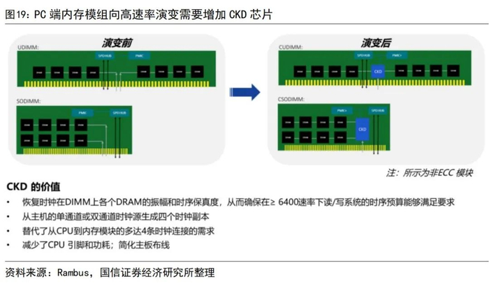 速率达到6400MT/s及以上时,PC内存模组需要增加独立的CKD芯片。随着DDR5传输速率持续提升,时钟信号频率越来越高,时钟信号完整性问题日益凸显。当DDR5数据速率达到6400MT/s及以上时,PC端的内存模组需采用专用时钟驱动器(CKD)芯片,对内存模组上的时钟信号进行缓冲和重新驱动,才能满足高速时钟信号的完整性和可靠性要求。JEDEC推出了增加独立CKD芯片的PC端内存模组标准,包括台式机的CUDIMM和笔记本电脑的CSODIMM。