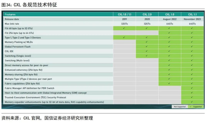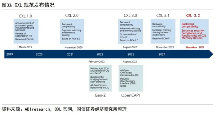 2024年12月CXL 3.2规范发布。第一代CXL规范CXL 1.0于2019年3月发布,此后每过一两年便会发布新版本,每个新版本均兼容早期版本。最新规范CXL 3.2于2024年12月发布,相比之前的版本,优化了CXL内存设备的监控和管理,增强了CXL内存设备在操作系统和应用程序方面的功能,并通过可信安全协议(TSP)扩展了安全性。