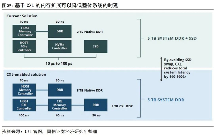 基于CXL的内存扩展可以提高容量,降低系统时延。内存容量受限于CPU内存通道数及DRAM容量,通过基于CXL的内存扩展可以在不停机的情况下添加更多的内存容量,从而增加系统的可扩展性。相比使用额外的NVMe SSD作为辅助内存,在保证容量的同时可以降低整体系统的时延。