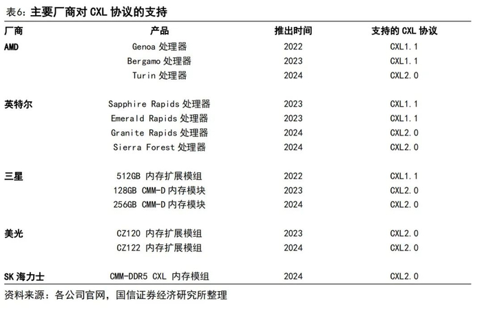 支持CXL的处理器和内存模组陆续上市,CXL生态逐渐建立。第一代支持CXL协议的CPU是AMD 2022年发布的第四代EPYC处理器,代号“Genoa”,支持CXL1.1,2024年AMD推出的代号为“Turin”的第五代EPYC处理器支持CXL2.0;英特尔自2023年推出的第四代至强Sapphire Rapids处理器开始支持CXL,至强6系列支持CXL2.0。内存方面,三星、美光、SK海力士均已发布支持CXL2.0的内存模组。2025年4月,SK海力士宣布其基于CXL 2.0标准的CMM-DDR5 96GB内存模块已完成客户验证。