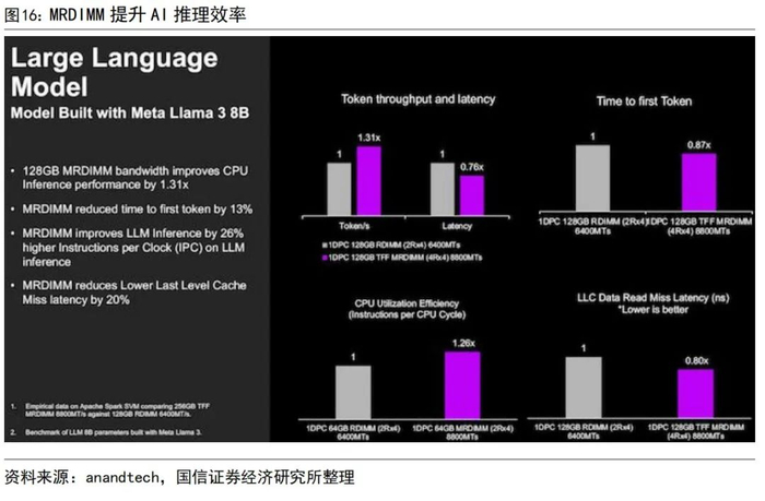 MRDIMM可以提升AI推理的效率。在内存容量相同的情况下运行Meta Llama 3 8B大模型,使用MRDIMM后,词元的吞吐量是RDIMM的1.31倍,同时延迟降低24%,首个词元生成时间降低13%,CPU利用效率提升26%,末级缓存延迟降低20%。