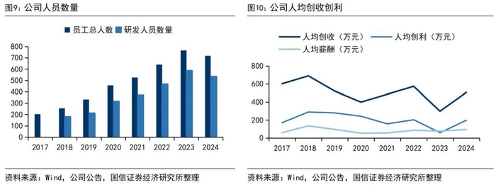 2024年人均创收507万元,截至年底研发人员共536人。公司研发人员从2018年的181人逐年增加到2023年的587人,2024年研发人员数量减少至536人,占总员工数量的75%。2024年公司人均创收为507万元,人均创利为197万元,人均薪酬为94万元。