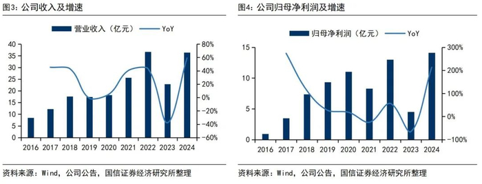 2016-2024年收入CAGR为20%,归母净利润CAGR为41%。公司收入从2016年的8.45亿元增长至2024年的36.39亿元,CAGR为20%,其中2024年同比增长59%。归母净利润从2016年的0.93亿元增长至2024年的14.12亿元,CAGR为41%,其中2024年同比增长213%。