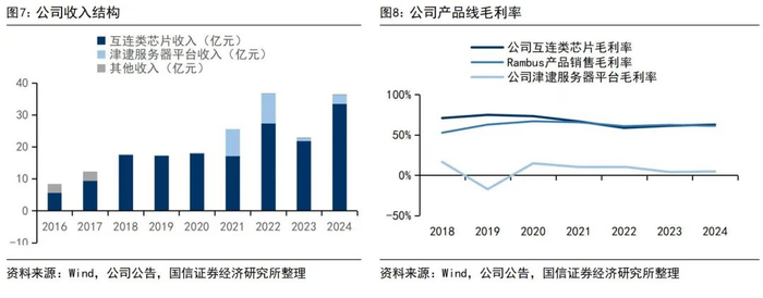 2024年92%的收入来自互连类芯片,该产品线毛利率为62.7%。公司收入主要来自互连类芯片和津逮服务器平台,2024年收入分别为33.49亿元和2.80亿元,收入占比分别为92.0%和7.7%,其中PCIe Retimer、MRCD/MDB、CKD三款新产品收入4.22亿元,是2023年的8倍。互连类芯片毛利率在2022年触底后逐年提高,2024年为62.7%,略高于国际可比公司Rambus产品销售61.2%的毛利率;津逮服务器平台客户采购需求波动较大,毛利率波动也较大,2024年为4.8%。