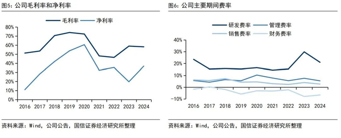 2024年毛利率为58%,净利率为37%。2024年公司毛利率为58%,下降0.8pct;净利率为37%,提高17.1pct。净利率提高主要得益于收入规模效应下期间费率下降,其中研发费率下降8.8pct至21%,管理费率下降2.2pct至5.4%,销售费率下降1.3pct至2.6%。