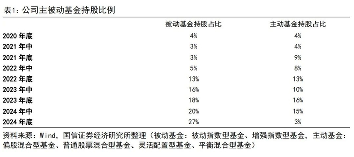 被动基金持股比例呈上升趋势,高于主动基金持股比例。从基金持仓情况来看,被动基金(含被动指数型基金、增强指数型基金)持有公司的股份比例一直呈上升趋势,2024年底为27%;主动基金(含偏股混合型基金、普通股票混合型基金、灵活配置型基金、平衡混合型基金)持有公司的股份比例波动较大,2023年底最高到16%,2024年底降至3%。