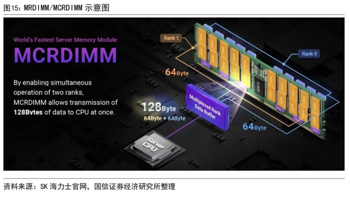 存储大厂积极推出MRDIMM模组,与RDIMM系统兼容。存储大厂方面,SK海力士、三星、美光均推出了MRDIMM模组,其中美光在2024年7月宣布已出样MRDIMM,将与英特尔至强6处理器兼容,为下一代服务器平台提供了亟需的带宽和容量,并降低了延迟,旨在扩展AI推理和高性能计算应用。MRDIMM与常规RDIMM采用相同的连接器和外形规格,在提高速率的基础上保证了成熟生态系统中的良好兼容性,从而减少企业的总拥有成本。根据美光官网,与RDIMM相比,MRDIMM有效内存带宽提升39%,总线效率提升超过15%,延迟降低40%。