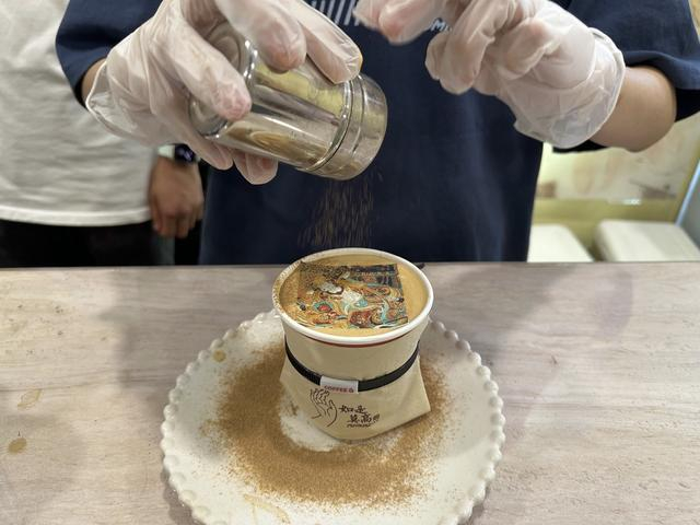 观展之余,观众对敦煌的热爱还延伸到了周边产品上。展厅一层的“沙洲拾光”咖啡厅是展厅外现场最火爆的地方,这里以敦煌杏皮茶为原料,调制四款敦煌特调饮品,其中最受欢迎的当数“如是莫高”特调咖啡,不仅味道上还原了敦煌当地特色,“飞天拉花”更是颇具文艺气息,很多观众品尝它之前都要拍上一张照片。