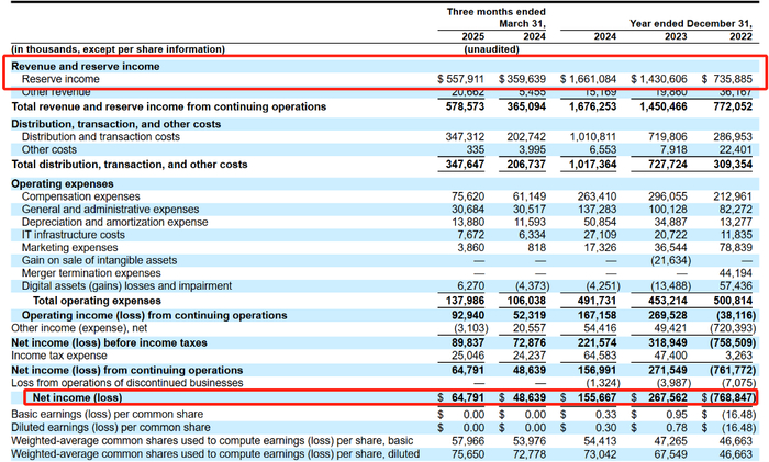 但看似“完美”的印钞机模式背后,Circle的财务数据呈现出增长与压力的双重面貌:2024年,Circle总收入和储备收入达到16.76亿美元,同比增长16%,较2023年的14.50亿美元稳步上升。然而,净利润却从2.68亿美元下降至1.56亿美元,跌幅达42%。
