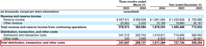 矛盾的财务数据背后,“分销、交易和其他成本”激增,Circle与Coinbase的利润分配协议是主要影响因素。