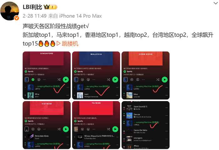 蓝鲸新闻记者查询发现,《跳楼机》于今年1月23日上线海外流媒体,截至6月3日,其在Spotify的播放量已经超过5400万。此前歌手LBI利比曾在今年2月28日发文称,《跳楼机》在各区阶段性战绩为:新加坡top1,马来top1,香港地区top1,越南top2,台湾地区top2,全球飙升top15。