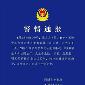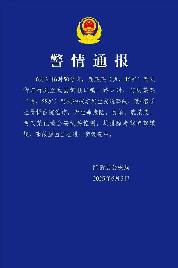 6月3日6时50分许,鹿某某(男,46岁)驾驶货车行驶至我县黄颡口镇一路口时,与明某某(男,58岁)驾驶的校车发生交通事故,致4名学生骨折住院治疗,无生命危险。目前,鹿某某、明某某已被公安机关控制,均排除毒驾醉驾嫌疑,事故原因正在进一步调查中。