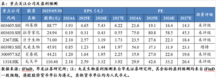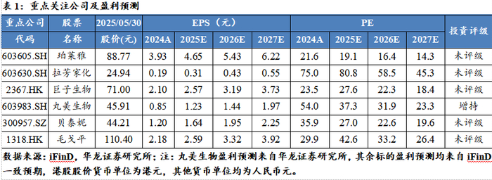 投资建议:珀莱雅正式发布械字号医用重组胶原蛋白敷贴,其创新应用不仅展现了珀莱雅在胶原蛋白技术转化与敏感肌护理领域的突破,凸显了重组胶原蛋白在医学护肤场景中的潜力,推动胶原蛋白从传统美容向医用级修护场景的深度延伸,建议关注产品升级空间。维持美容护理行业“推荐”评级。建议重点关注:1)凭借完善的品牌矩阵与全面的品类布局,增长势头强劲:丸美生物、珀莱雅;2)精准把握细分赛道,随着国潮与高端美妆的崛起,有望迎来快速发展:巨子生物、毛戈平;3)以高性价比为切入点,同时具备强大的产品创新力:贝泰妮、拉芳家化。