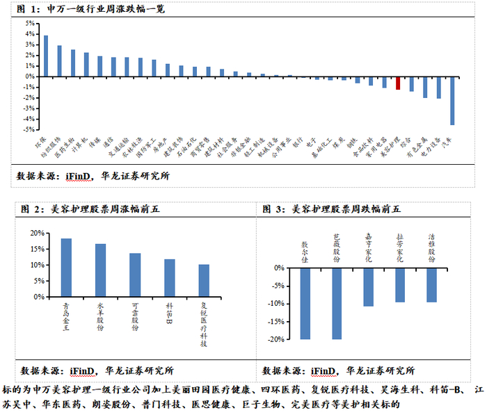 2025年5月26日-5月30日,申万美容护理指数下降1.24%。板块个股涨幅前五名分别为青岛金王(002094.SZ)、水羊股份(300740.SZ)、可靠股份(301009.SZ)、科笛-B(2487.HK)、复锐医疗科技(1696.HK)。板块个股跌幅前五名分别为敷尔佳(301371.SZ)、芭薇股份(837023.BJ)、嘉亨家化(300955.SZ)、拉芳家化(603630.SH)和洁雅股份(301108.SZ)。