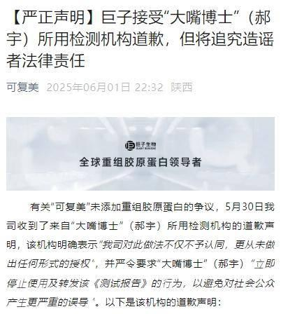 随着舆论发酵,各方争议不断升级。6月2日下午,“大嘴博士”再次发文,对巨子生物作出回应称,无法确认其声明中所使用的检测机构免责声明的真实性。同时,他认为巨子生物“把声明中的‘遗憾’篡改为了‘道歉’”,并对其迟迟未能公布相关检测结果的情况提出质疑。