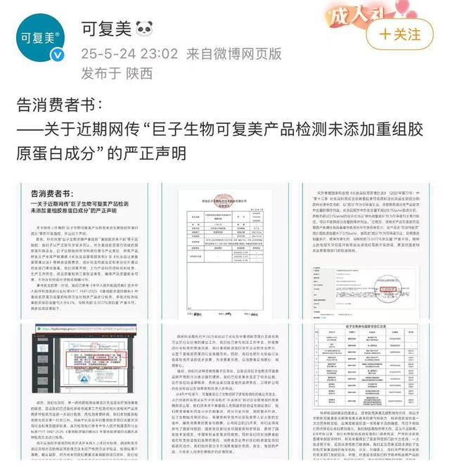 5月24日,自称“香港大学化学博士”的美妆博主“大嘴博士”在其多个社交媒体账号发布题为《巨子生物疑似造假?!重组胶原竟然测不到胶原!》的文章,公开质疑巨子生物旗下可复美产品“可复美胶原棒”(即“可复美Human-like重组胶原蛋白肌御修护次抛精华”)涉嫌严重造假。