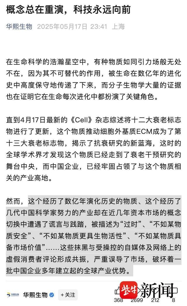 公开信息显示,华熙生物以玻尿酸(透明质酸)为核心,旗下有润百颜、夸迪、米蓓尔、BM肌活等品牌;巨子生物则专注于重组胶原蛋白,拥有可复美、可丽金等八大主要品牌。双方的业务布局,早已为这场交锋埋下伏笔。5月17日,华熙生物曾在其官方微信公众号发布《概念总在重演,科技永远向前》的文章,点名9家券商机构,指责其研报通过“不科学对比”鼓吹“玻尿酸过时论”、吹捧重组胶原蛋白的行为。