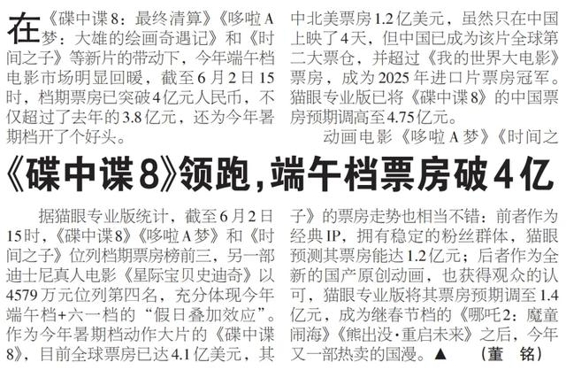 在《碟中谍8:最终清算》《哆啦A梦:大雄的绘画奇遇记》和《时间之子》等新片的带动下,今年端午档电影市场明显回暖,截至6月2日15时,档期票房已突破4亿元人民币,不仅超过了去年的3.8亿元,还为今年暑期档开了个好头。