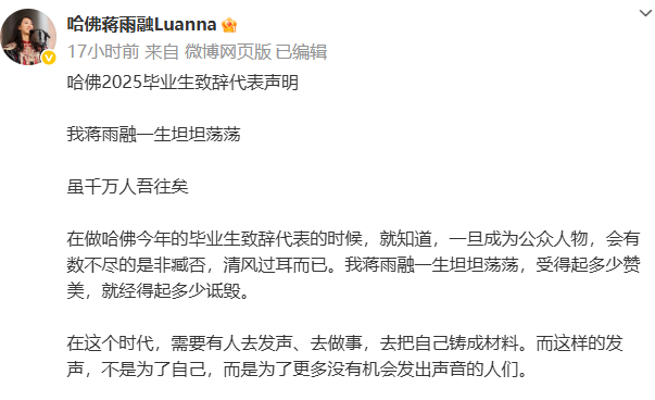 25岁的蒋雨融来自中国青岛,获得哈佛大学国际发展方向的公共行政硕士学位。此前,有标注为“哈佛蒋雨融Luanna”账号以《哈佛校史第一位中国女毕业生代表致辞,全场泪崩》为题分享视频介绍自己,并称“本不是想在公共平台抛头露面的人”“总还是有人得站出来去争取发声”。