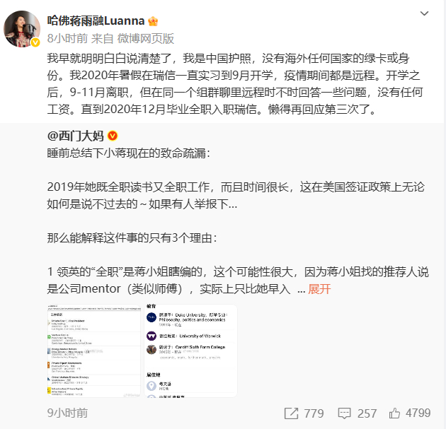 6月3日凌晨,蒋雨融再次微博发文,回应身份争议:“我是中国护照,没有海外任何国家的绿卡或身份。我2020年暑假在瑞信一直实习到9月开学,疫情期间都是远程。开学之后,9-11月离职,但在同一个组群聊里远程时不时回答一些问题,没有任何工资。直到2020年12月毕业全职入职瑞信。懒得再回应第三次了。”
