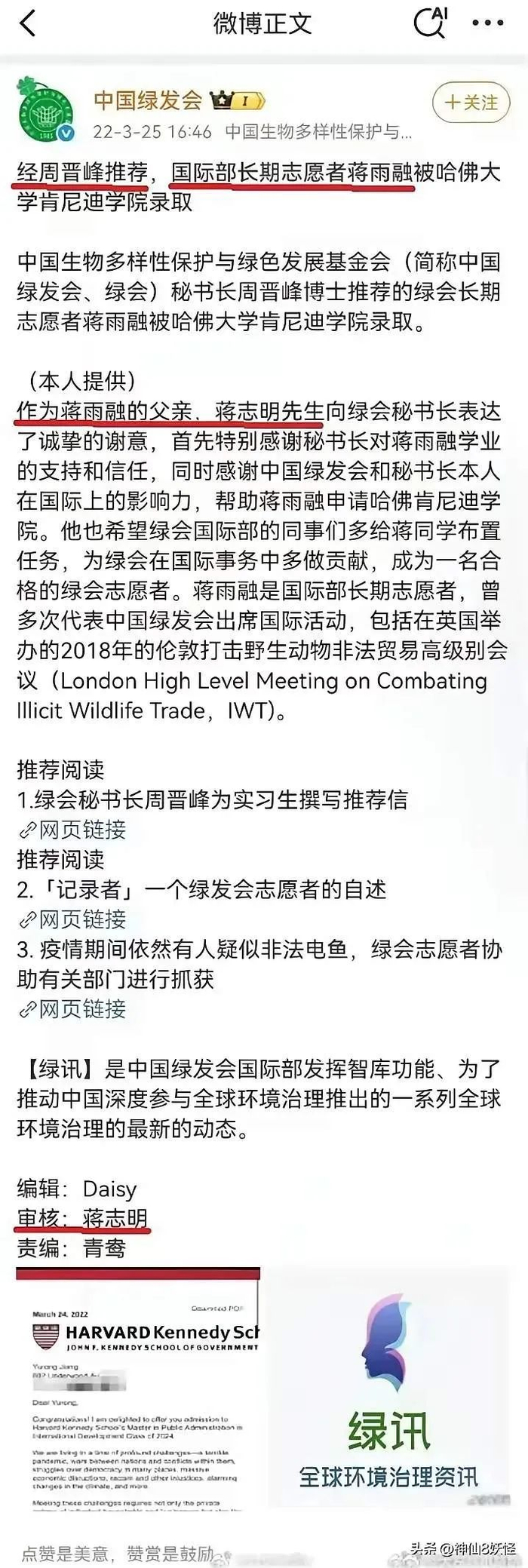网传截图显示,中国生物多样性保护与绿色发展基金会(以下简称“中国绿发会”)曾经在2022年写过一篇博文,内容为绿发会秘书长周晋峰推荐的国际部长期志愿者“蒋雨融”被哈佛肯尼迪学院录取。“蒋雨融”的父亲“蒋志明”发言感谢。