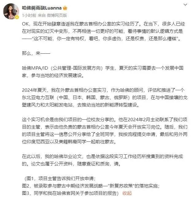 随后,她又更新微博回应外界对其在蒙古国实习经历的质疑,称“这个实习机会是由我们项目的一位校友分享的,在此以后,我的哈佛毕业论文,也是依据这段实习工作经历所搜集到的资料完成的。论文也属于公开资料,随意查证和质询。”