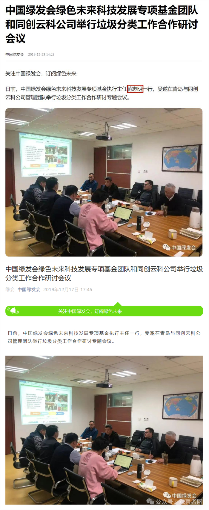 在中国绿发会2019年发布的文章中,“蒋志明”的头衔为中国绿发会绿色未来科技发展专项基金执行主任。