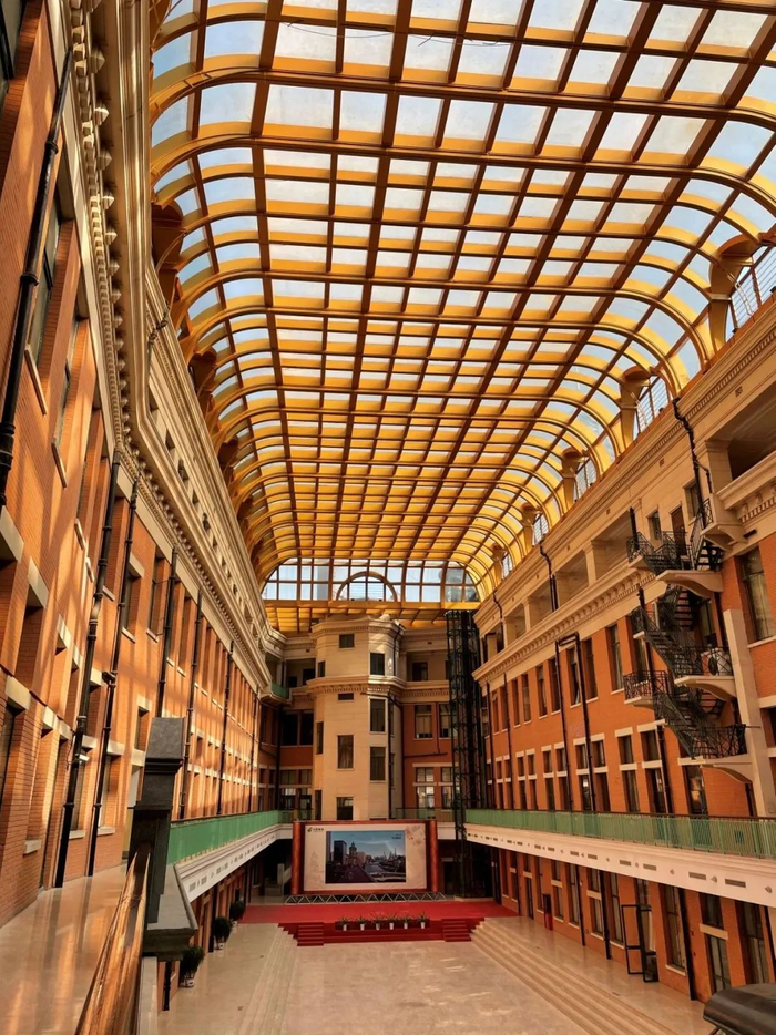 原上海总商会大楼建于1916年,建筑融合了东西方元素,既有西方古典建筑的庄重典雅,又融入了海派建筑的精致灵动,是海派文化的重要代表。立面以清水红砖为主,基座采用苏州花岗岩,融合文艺复兴时期的装饰元素。议事大厅跨度超18米,采用拱形钢构屋顶,可容纳800余人,体现了实用性与庄重性的结合。