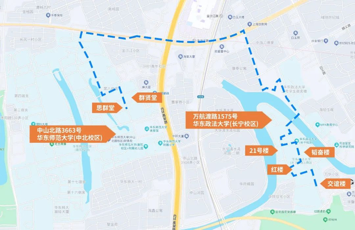 本期骑行苏河系列,将带您体验专项规划中的“校园风情段”,预计骑行约3.3公里,先后打卡:万航渡路1575号华东政法大学(长宁校区):21号楼——韬奋楼——交谊楼——红楼;中山北路3663号华东师范大学(中北校区):思群堂——群贤堂。