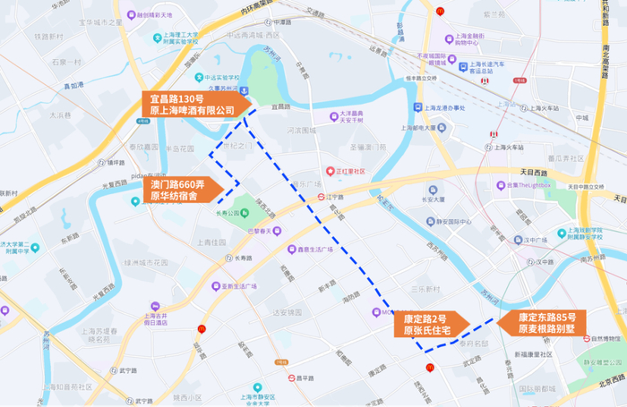 时至今日,这些苏河两岸的历史建筑,已逐渐成为社区文化中心、环保主题公园、创意办公区与市井生活场域等极具活力的当代空间。本期骑行苏河系列,将跨越都市经典段(河口-昌平路桥)与时尚创意段(昌平路桥-曹杨路桥),预计骑行约3.7公里,沿途经过:康定东路85号(原麦根路别墅)——康定路2号(原张氏住宅)——宜昌路130号(原上海啤酒有限公司)——澳门路660弄(原华纺宿舍)。