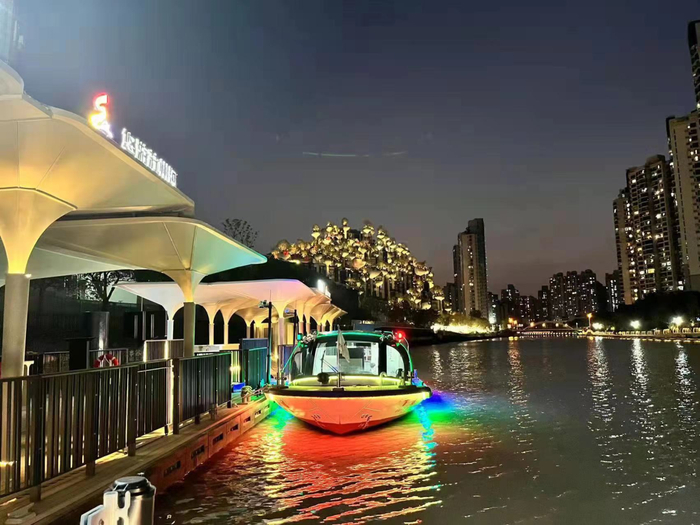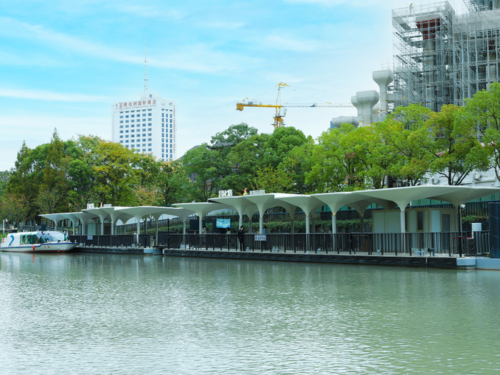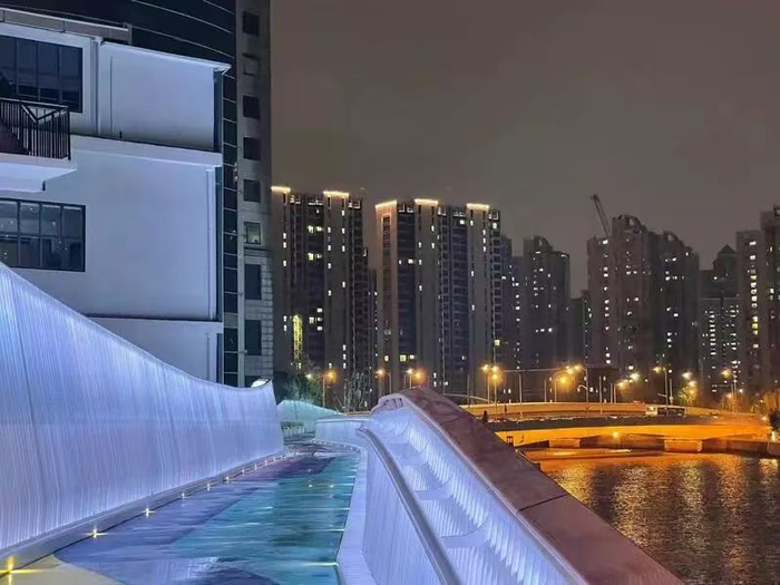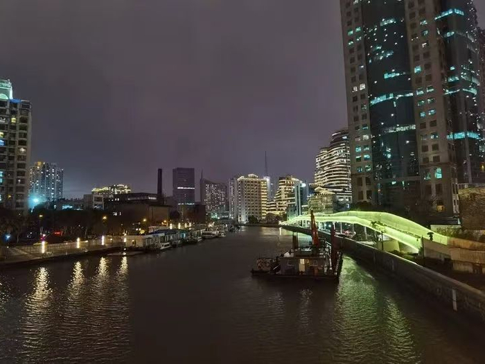 骑行苏河,除了两岸的建筑,岸边的驿站、栈桥、码头……步步皆是景。在一片古典主义风格老建筑包围中的蝴蝶湾驿站,线条简约、空间通透,驿站前上千平方米的花园内,碧绿的草坪和灰色碎石地面轮廓线条柔和;1.5公里外,长寿路桥北侧260米长的光音栈桥,宛如长虹卧波,彩色光影随着音乐节奏流动,给你沉浸式的视听体验;古北路桥东侧的昌化路码头,老渡口焕新生,新与旧、古典与现代,在苏州河畔和谐共融。