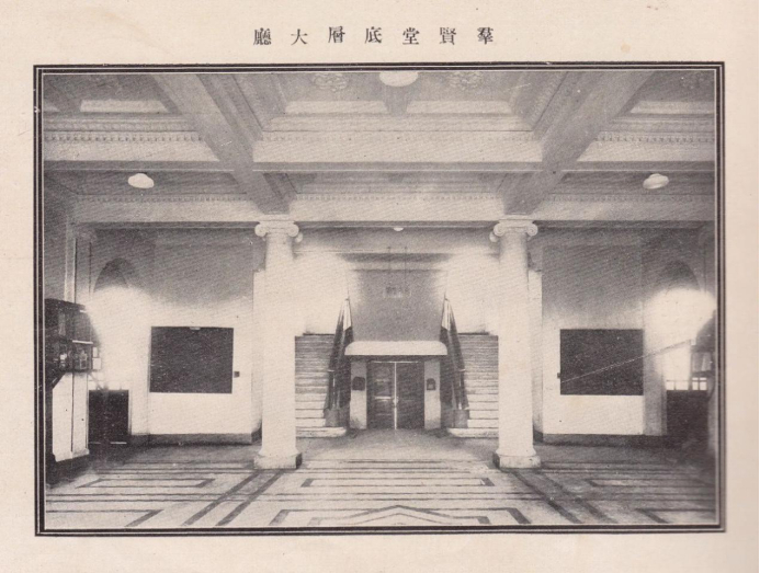 作为大夏大学的中心建筑,群贤堂为三层钢骨水泥混合框架结构,长约61米,宽约21米,建筑面积3643平方米,入口门廊通高两层,以并列四根爱奥尼亚式立柱支承。群贤堂内有大小教室及办公室32间。