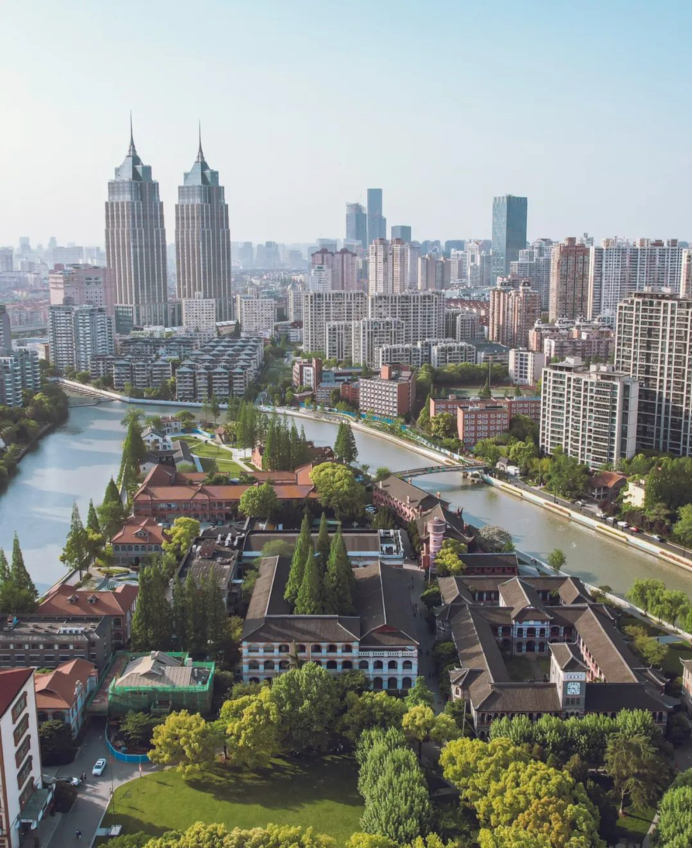 骑行于苏州河畔,两岸的法桐树影婆娑,日光倾下,勾勒出一幅流动的历史画卷。这条蜿蜒的母亲河,不仅串联起上海的繁华与静谧,更将百年学府的厚重底蕴与城市文脉悄然编织。从华东政法大学长宁校区的砖券洋楼,到华东师范大学中北校区群贤堂的罗马门柱,每一座历史建筑都如一本打开的书,诉说着百年峥嵘岁月。骑行于此,既是与城市肌理的亲密对话,也是一次穿越时空的文化寻踪——苏河的波光里,倒映着高校百年变迁的剪影,亦是历史与现代的交错。