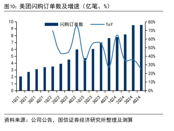 近年,传统电商的增长已经逐渐见顶,京东、淘天自营零售的季度增速都已经跌至个位数。根据华西证券,美团闪购的年增长速度达到23%。