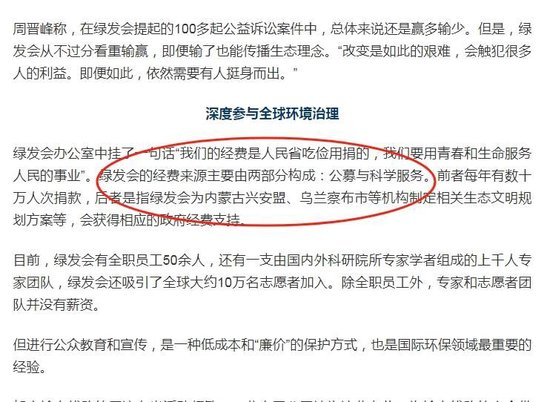 值得注意的是,该篇报道中写到绿发会的经费来源主要由两部分构成:公募与科学服务。前者每年有数十万人次捐款,后者是指绿发会为内蒙古兴安盟、乌兰察布市等机构制定相关生态文明规划方案等,会获得相应的政府经费支持。
