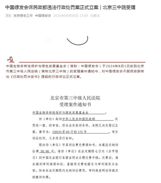 2024年8月6日,绿发会发文称,2024年8月1日收到北京市第三中级人民法院(简称北京三中院)的受理案件通知书,对中国绿发会不服民政部做出《行政处罚决定书》提起的行政诉讼正式立案。