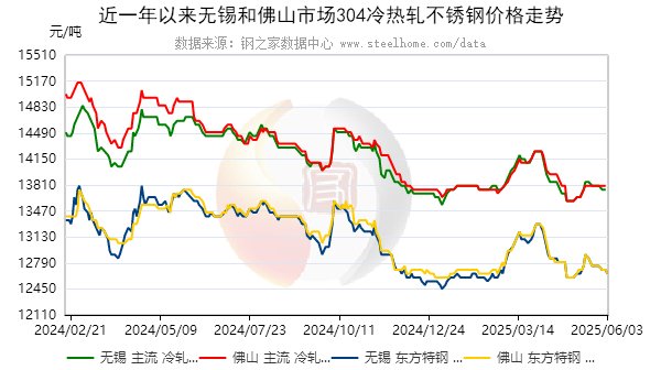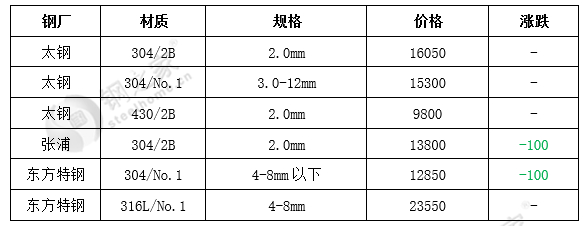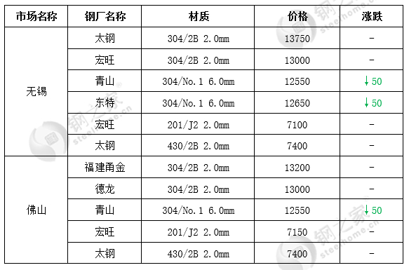 现两大主导市场具体情况如下:无锡市场304热轧价格下跌50元/吨,其余稳定。佛山市场304热轧价格下跌50元/吨,其余稳定。