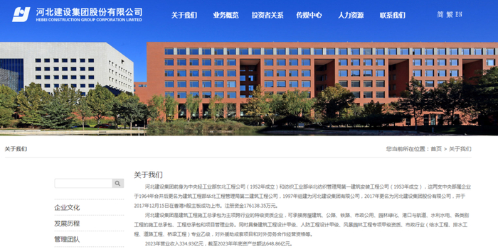 据河北建设集团官方网站介绍,公司是建筑工程施工总承包为主项跨行业的特级资质企业,并于2017年12月15日在香港H股主板成功上市。公司2023年营业收入334.93亿元,截至2023年年底资产总额达648.86亿元。其称,公司具有强大的投融资实力,银行授信额突破1094亿元。